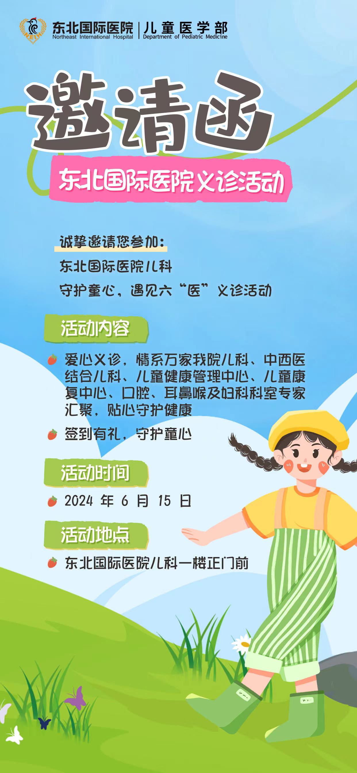儿童是国家的未来,民族的希望,促进儿童健康成长是全社会的责任。东北国际医院儿科体系将于6月15日开展“守护童心 遇见六‘医’”义诊活动。儿科、中西医结合儿科、儿童健康管理中心、儿童康复中心、口腔中心、耳鼻喉科及妇科等科室专家,共同守护儿童健康。