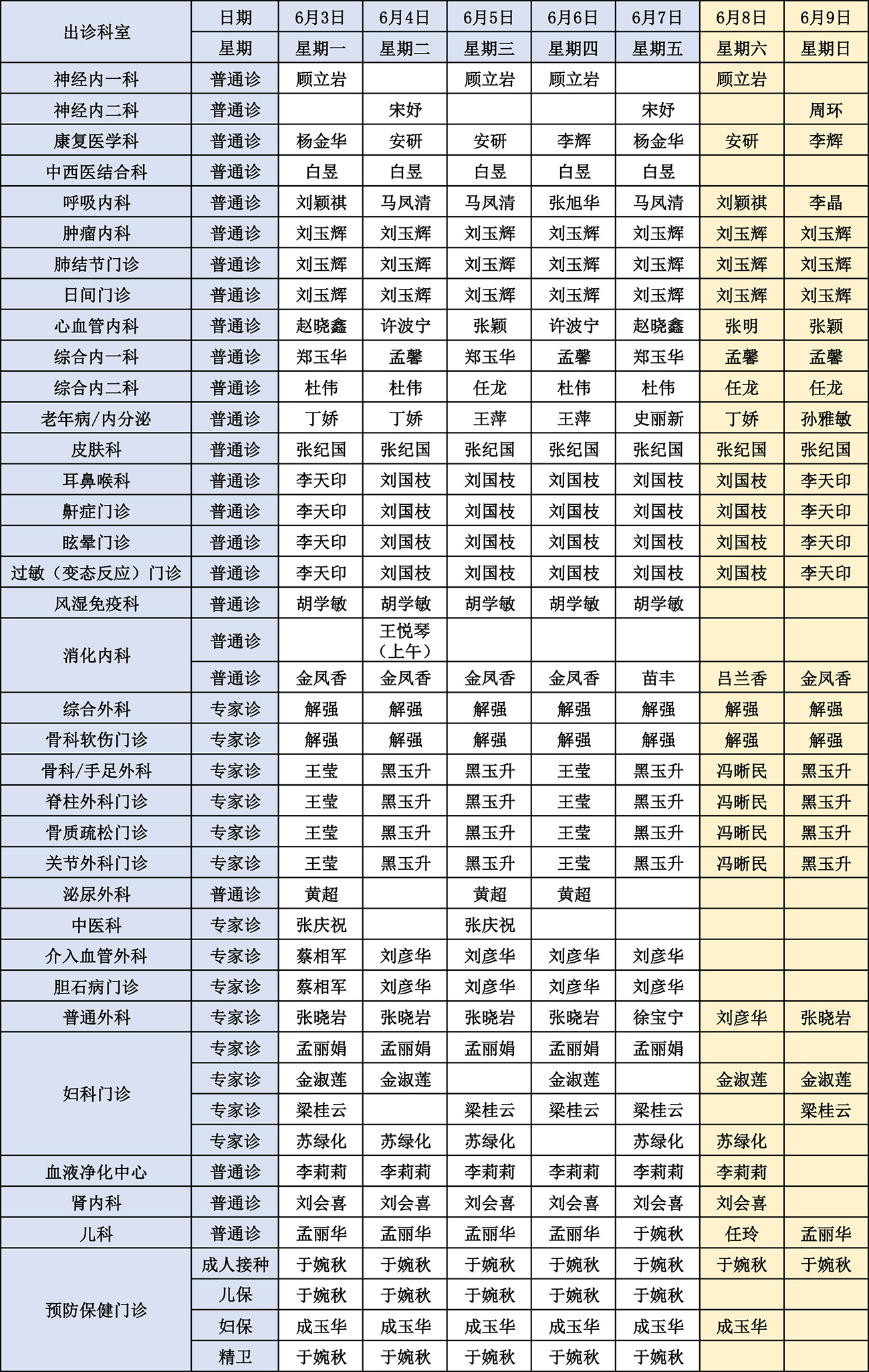 出诊信息|东北国际医院北部院区6月3日-6月9日出诊安排