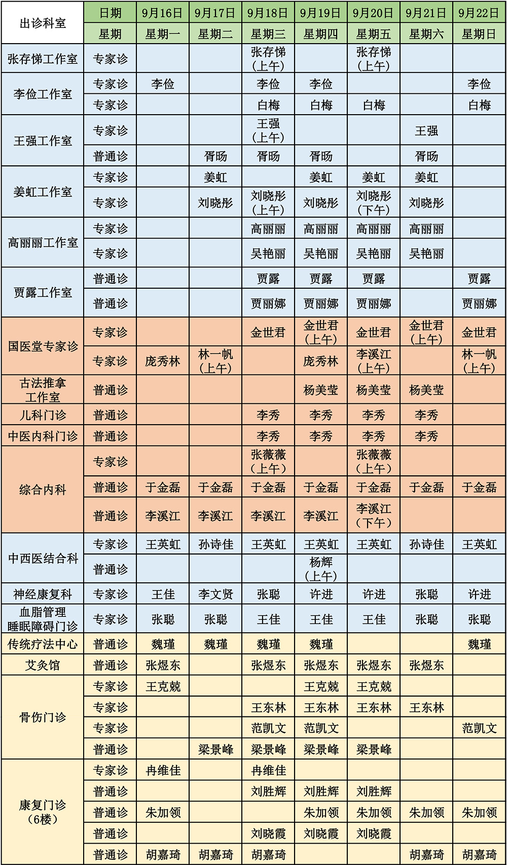 出诊信息|东北国际医院中医医院9月16日-9月22日出诊安排