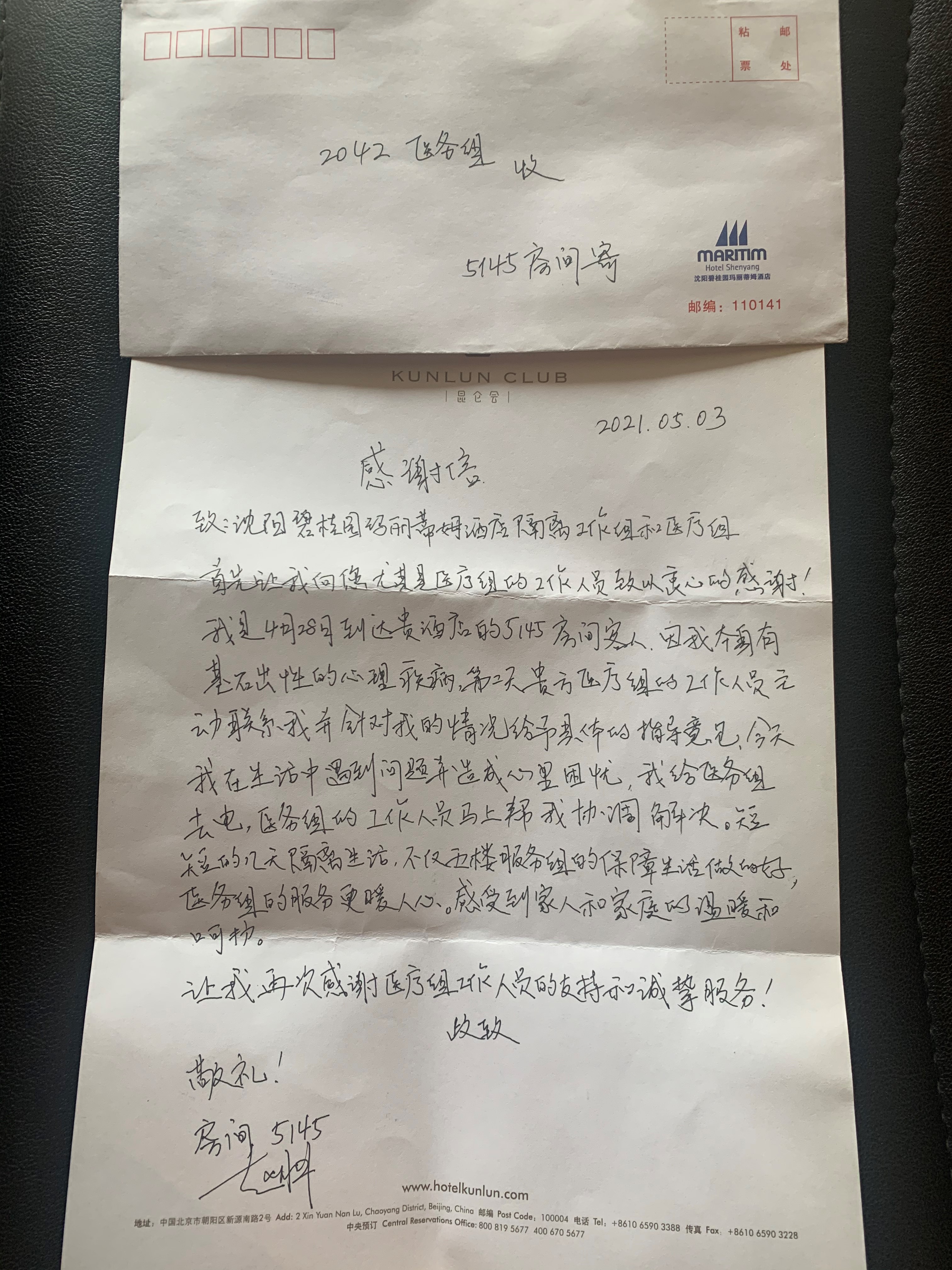 隔离酒店的工作紧张、忙碌,但在医护人员配合下,工作进展正常高效。在进驻的第三天,徐聪医生就收到了来自隔离人员的感谢信。