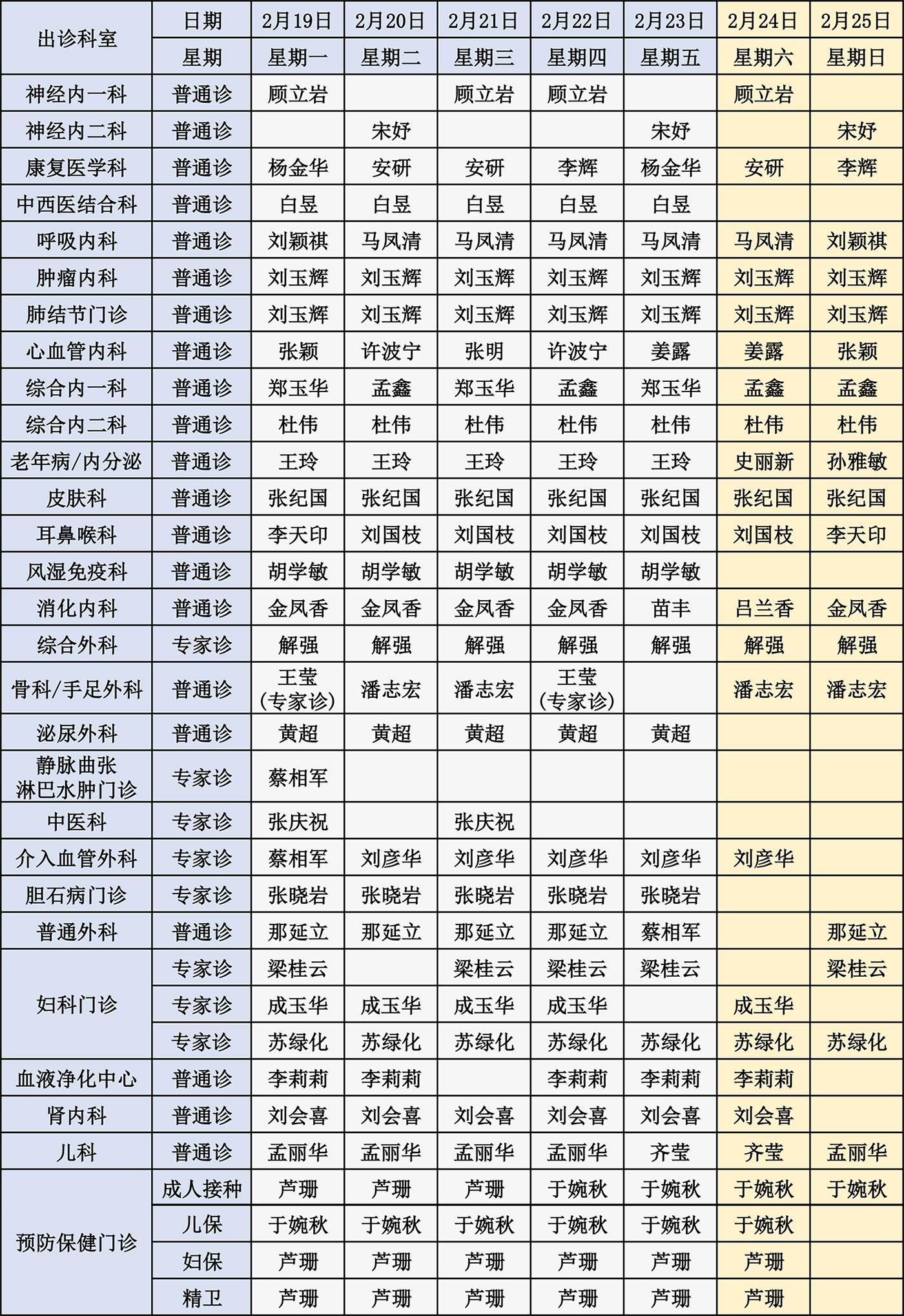 出诊信息|东北国际医院北部院区2月19日-2月25日出诊安排