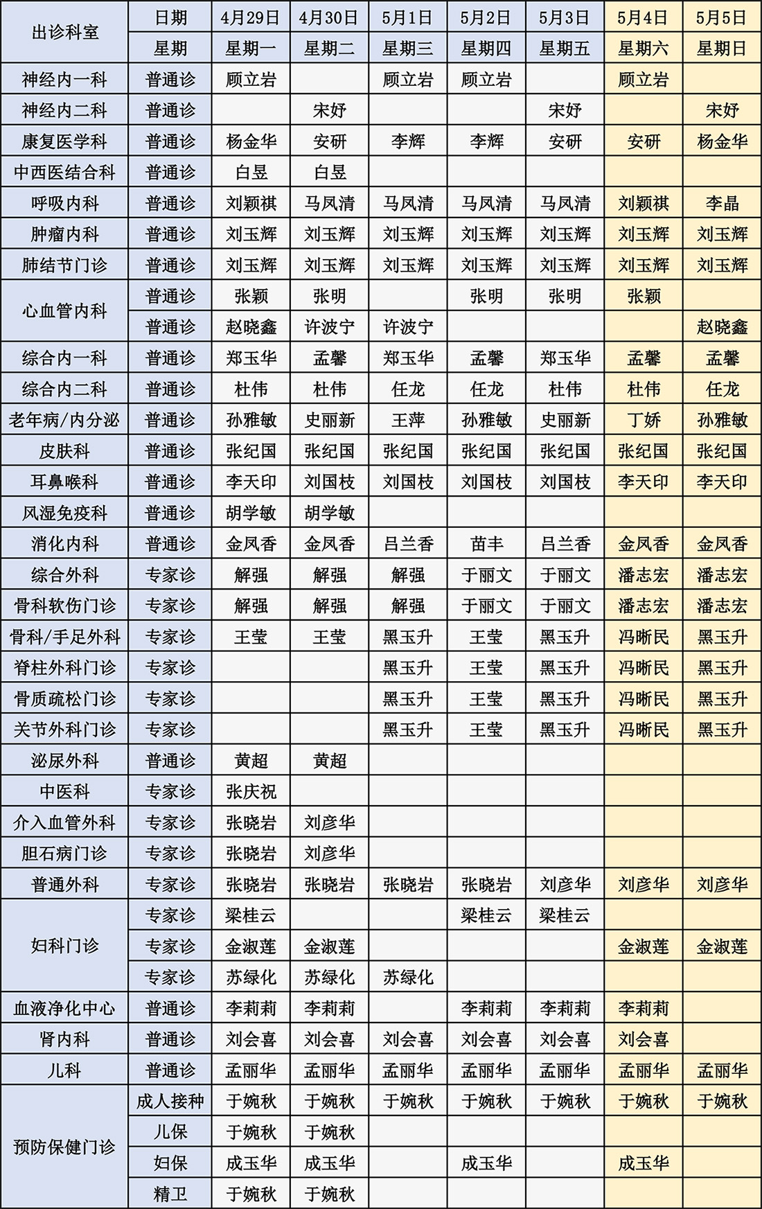 出诊信息|东北国际医院北部院区4月29日-5月5日出诊安排