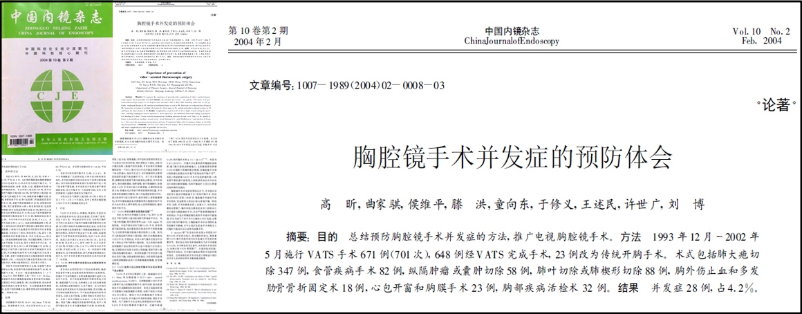 最初胸外科手术多采用后外侧25-30厘米标准切口,撑开肋骨或去除肋骨,创伤大,恢复慢,年高体弱患者难以接受。随着胸腔镜及微创器械的发展,胸腔镜及辅助小切口微创手术在国内少数医院逐步开展,早在1993年高昕主任就在东北地区最先开展了电视胸腔镜微创外科手术,2004年在中国内镜杂志发表了当时国内例数最多的论著报道,几年以后又辅助省内外多家医院陆续开展了胸腔镜微创手术。